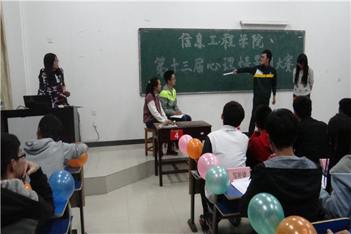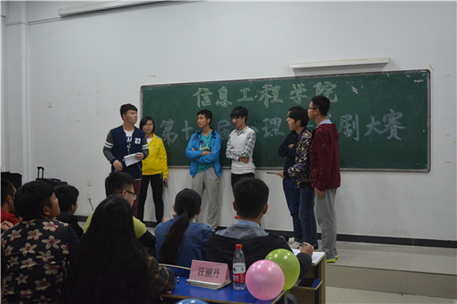 11月3号晚,信息学院举办的以“找寻”为主题的心理情景剧大赛于14栋111上演,信息学院团委书记陈文锦、团委副书记杨青出席比赛12届心理剧获奖剧导演宋嘉诚、最佳主演樊宇森、最佳男演员蒙骏、14届学生会副主席兼素质拓展中心主席孙兴、15届学生会主席宦思远、副主席刘娜担任评委