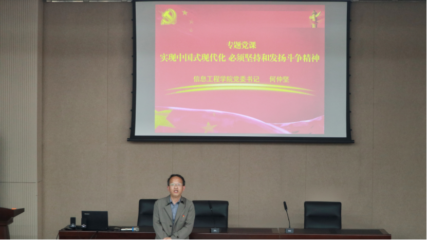 4月27日,信息工程学院于教5栋108校友报告厅召开全院教职工大会,院党委书记何仲坚以“实现中国式现代化,必须坚持和发扬斗争精神”为题,上了一堂专题党课。