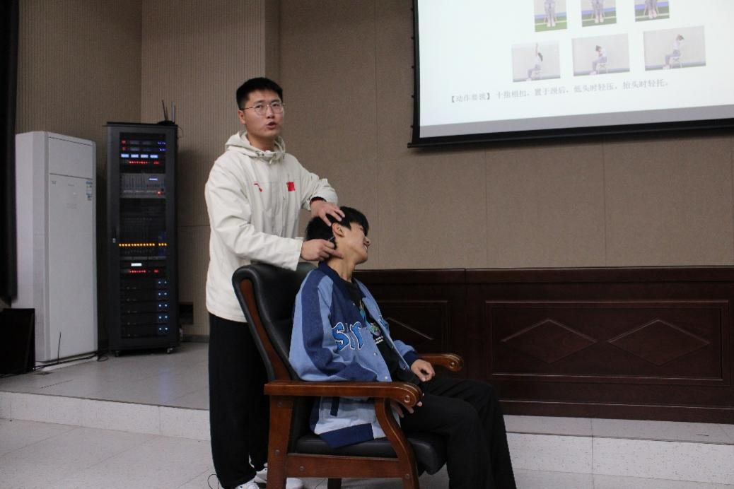 简鹏就目前学生的久坐行为,从久坐群体的健康状况、人群特点以及健身方法为学生讲解相关知识。他着重强调了久坐对于个人身体健康、生活方式和体态方面的危害。会上,简鹏分享了适合久坐人群的锻炼方法并邀请学生示范锻炼动作,详细讲解了每个动作的要领以及作用。