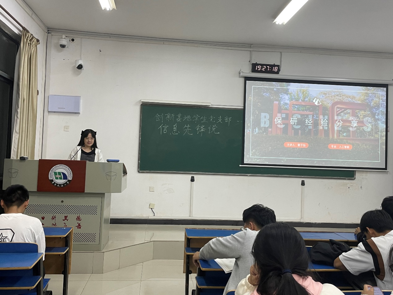2023年11月7号,信息工程学院举办“信息先锋说”第十四期分享会。此次会议由创新基地学生党支部组织并承办。支部成员雷子怡同志成功推免至厦门大学,因此她以保研经验为主题作分享交流。计算机2023-4、6班、通信工程2022-3、4班同学参加分享会。