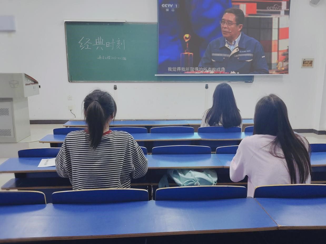 5月9日,信息学院2023级通信工程1、2、3班在逸夫楼415教室开展了第十七次“经典时刻”活动,观看视频《感动中国 2023年度人物颁奖盛典 》,致敬以科技报国的张连钢。