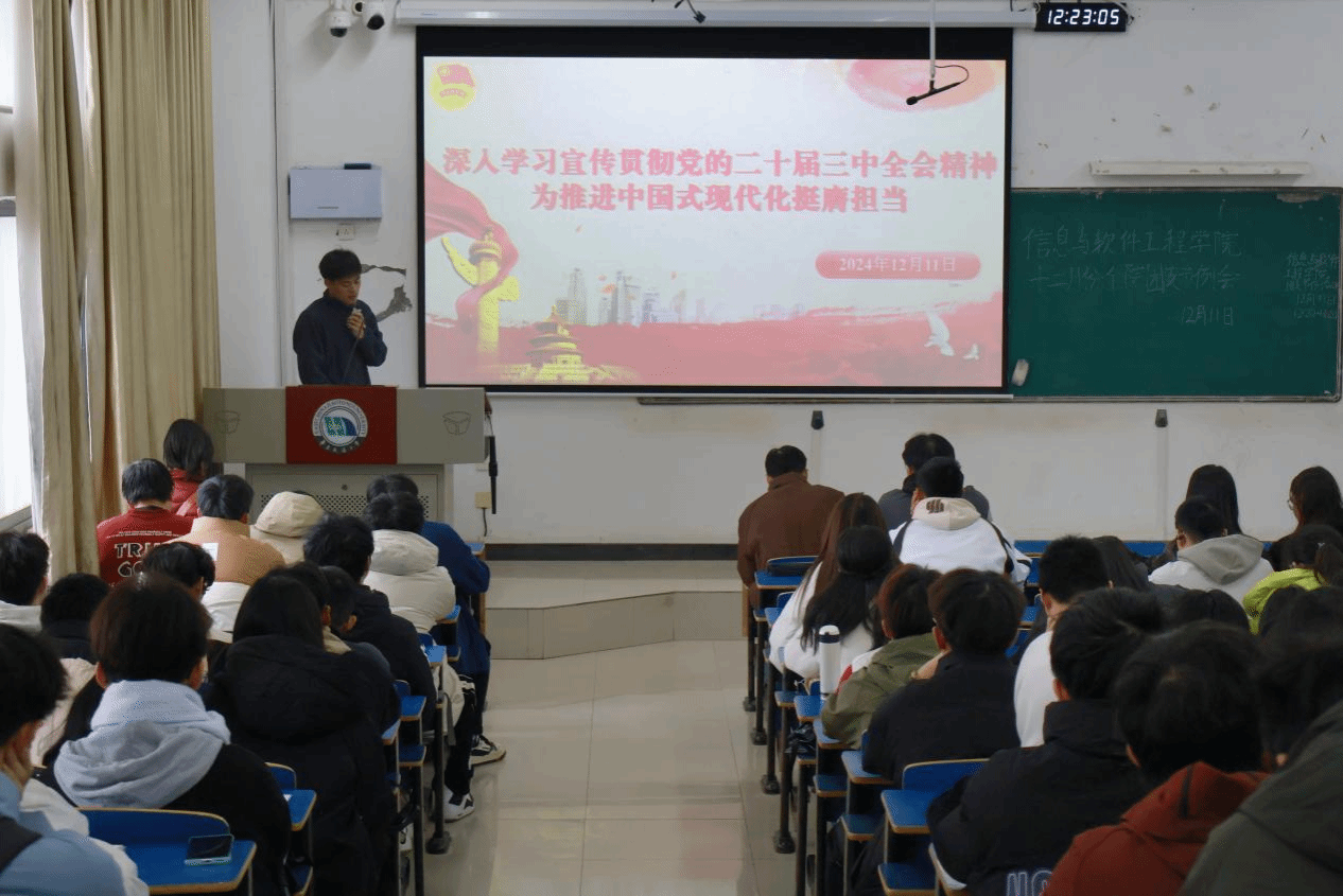 为深入学习贯彻党的二十届三中全会精神,引领信工青年肩负时代使命,2024年12月11日,青年讲师团成员刘通为青年团干讲述题为“深入学习贯彻党的二十届三中全会精神,为推进中国式现代化挺膺担当”的主题团课。